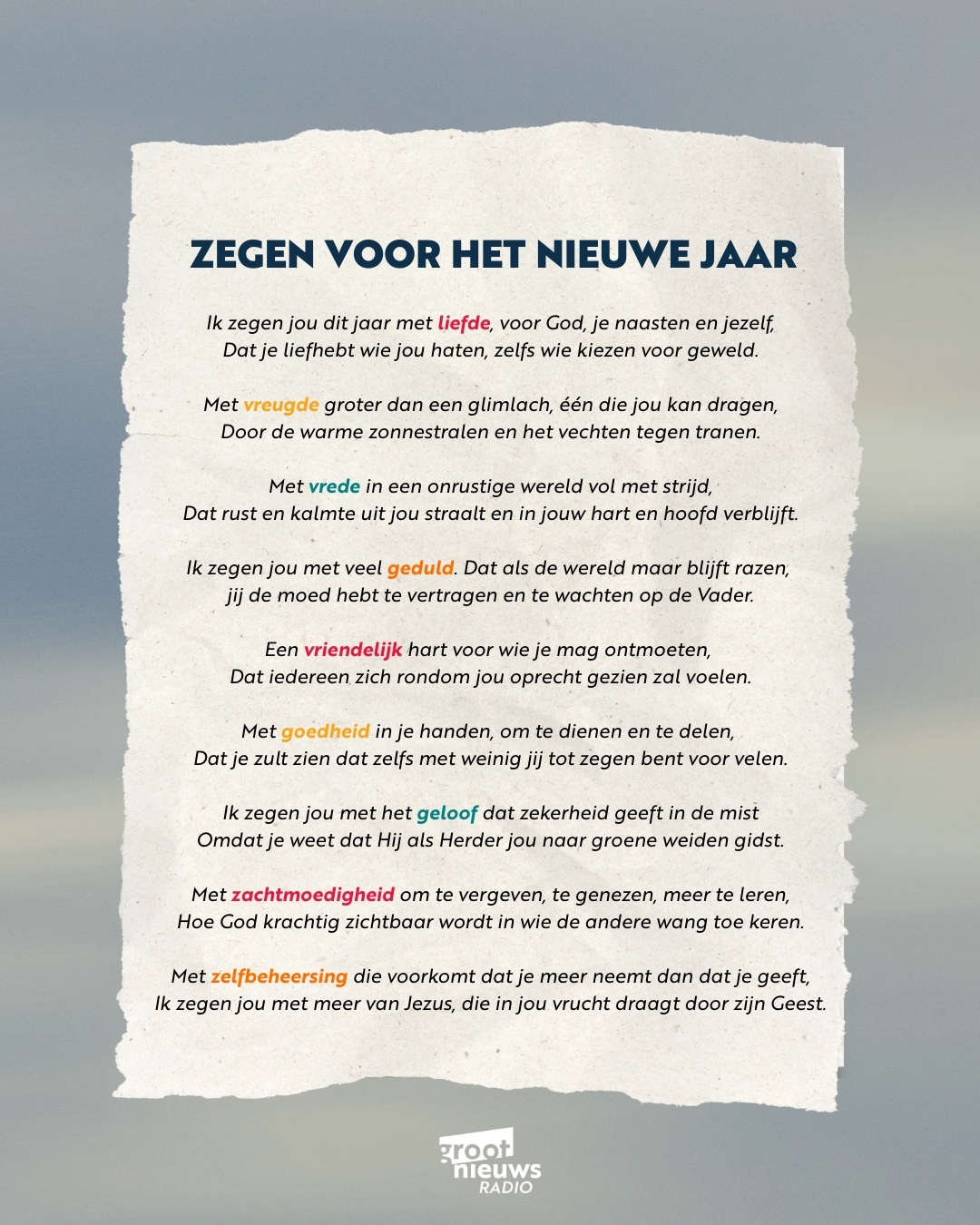 Onze collega Martin schreef een prachtige zegen voor 2026. Woorden over leven vanuit de vrucht van de Geest, juist midden in een onrustige wereld. Wil jij deze zegen naar iemand doorsturen? Kopieer de tekst hieronder of download 'm hier als afbeelding!